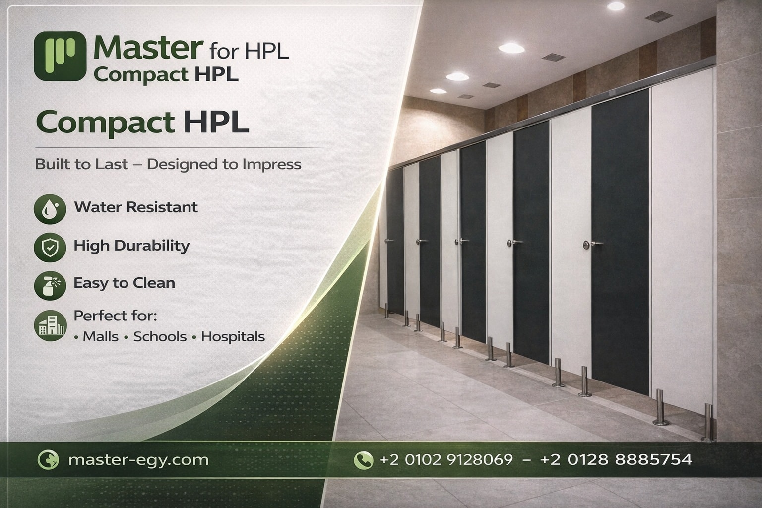 Master Seeks To Be The Leading Supplier In Compact HPL Field HPL Bathroom Partitions. Master Offers After-Sales Service And Maintains Our Products And Provides Warranties Up To 10 Years Because We Have The All Of Accessories To Maintain And Repair Any Problem. It May Happen , And We Have All Colors And Shapes Of Compact HPL. We Also Have Experience In This Field Through The Help Of Our Technical Team.